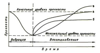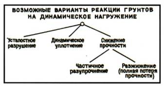 Рисунок 12. Возможные реакции грунтов на динамические нагрузки. Для водонасыщенных песков в данной технологической схеме используется эффект разжижения (полная потеря прочности) слоя на контакте «свая-грунт» ударной волной, порождаемой в твердеющем бетоне. Для глин используется механизм динамического уплотнения разрыхленного бурением слоя на контакте «свая-грунт». Как правило, при ЭРГТ обработке тела свай в связных грунтах значительных уходов бетона не наблюдается. Данное поведение объясняется высокой амплитудой импульса и малым интервалом его действия (время измеряется микросекундами). Необходимо отметить, что можно с помощью ЭРГТ обработки можно получить и обратные эффекты. Например, многократное динамическое воздействие для песков может привести к частичному разуплотнению (см. рис. 12), для глин - к снижению прочности (см. рис. 13 (б)).