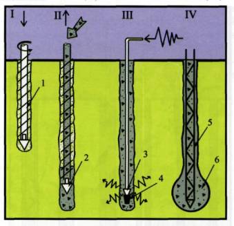 Рисунок 17. Технологическая схема устройства буроинъекционных свай «ГЕО» с применением вторичной инъекции. I - бурение скважины с применением проходных шнеков, II, III - Извлечение буровой колонны с одновременной опрессовкой скважины через клапан шнека (первичная опрессовка), IV - погружение армокаркаса в твердеющий бетон, V - вторичная опрессовка сваи через клапан армокаркаса. Условные обозначения. 1 - проходной шнек, 2 - клапан шнека, 3 - армокаркас, 4 - инъекционная трубка, 5 - клапан армокаркаса, 6 - бетон вторичной инъекции. К возможным недостаткам данной технологии можно отнести многодельность каркаса. При первичной опрессовке через проходной шнек возможно запрессовка буровой колонны (если по разрезу есть сухие пески). После устройства практически каждой сваи требуется промывание всей буровой колонны. По технологии вторичная опрессовка может выполняться на любом горизонте, где она наиболее эффективна (для этого на каркасе клапан необходимо установить в нужном горизонте), однако из-за единообразия клапан располагается в нижней части скважины.