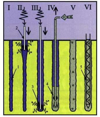 Рисунок 16. Технологическая схема устройства буроинъекционных свай РИТ* (разрядноимпульсная технология, патент 2087617 С1, 6Е02-Д5/34). I - Устройство скважины и заполнение ее рабочей жидкостью, II, III - Расширение скважины РИТ-обработкой, IV - Замещение рабочей жидкости бетоном, V, VI - погружение арматурного каркаса в твердеющий бетон. Условные обозначения. 1 - скважина, заполненная рабочей жидкостью, 2 - штанга, 3 - электрический излучатель, 4 - бетон, 5 - каркас. Отличительной особенностью указанной технологии является устройство скважины чуть больше диаметра излучателя на 1-м этапе. Скважина для РИТ-обработки заполняется рабочей жидкостью. Далее производится РИТ-обработка скважины для обеспечения заданного проектного диаметра сваи. Обеспечение требуемого проектного диаметра может повлечь обратные эффекты (частичное разуплотнение, снижение прочности), описанные выше. Фирма «ГЕОТЕХНИКА» применяет свою технологию (сваи «ГЕО»). Технологическая схема устройства свай показана на рис. 17. Вторичная опрессовка производится через клапан, размещаемый в каркасе (см. рис. 17).