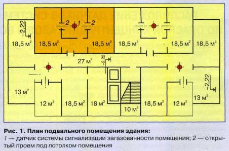 В предложенном способе формирования охранного пространства загазованного подвального помещения [6], включающем установку датчиков на его потолочной зоне с удалением от потолка на 100-200 мм, с учетом времени, необходимого для прибытия аварийной службы, минимальная площадь контролируемого помещения каждым датчиком рассчитывается по формуле