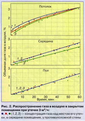 Результаты компьютерных расчетов с использованием численного метода Рунге-Кутта для различных объемов газа, поступающих в помещение от 0,1 до 100 м3/ч, позволяют сделать следующие основные выводы: 1. Распространение газа в подвижной воздушной среде происходит в основном за счет конвективного обмена, а в неподвижной - за счет гравитационных сил. Диффузия газа в воздухе в этом случае, как фактор создания взрывоопасных концентраций, практического значения не имеет. 2. Газ восходящей струей быстро поднимается вверх. Примерно через 1 -2 с он уже оказывается у потолка помещения, коснувшись которого, сразу растекается по нему сравнительно тонким слоем. 3. Происходит послойное покрытие последующих слоев газа по предыдущим. При этом концентрация газа в воздухе в общем слое начинает возрастать по мере приближения к потолку помещения. Экспериментальные исследования проводились в помещении площадью 32,5 м2 размером 5,7´5,7 м и высотой 3 м. В помещении была выполнена хорошая герметизация дверного и оконных проемов и обеспечена низкая кратность воздухообмена, около 0,5 (критические условия для подвальных помещений). Помещение имело одинаковую температуру внутри и снаружи, что исключало конвективный воздухообмен. Газ в атмосферу помещения подавался снизу (средняя часть стены). Концентрацию газа в воздухе замеряли по оси помещения в трех местах: у стены над впуском газа, в середине помещения, у противоположной стены. В каждом из указанных мест камеры замеры проводились на одинаковой высоте в трех точках: на расстоянии 3 см от потолка, 1,5 м от пола и 3 см от пола. Расход газа замерялся счетчиком, а его концентрация в воздухе - газоанализатором ЕХ-ТЕХ РМ фирмы ФРГ «Герман Северин» с пределом измерения от 0 до 5 % об. метана и погрешностью 0,2 % от максимального предела измерения. Утечки газа были условно разделены на средние - 3 м3/ч (0,1 м3/ч на 1 м2), большие - 9 м3/ч (0,3 м3/ч на 1 м2) и максимальные (рис. 2,3).