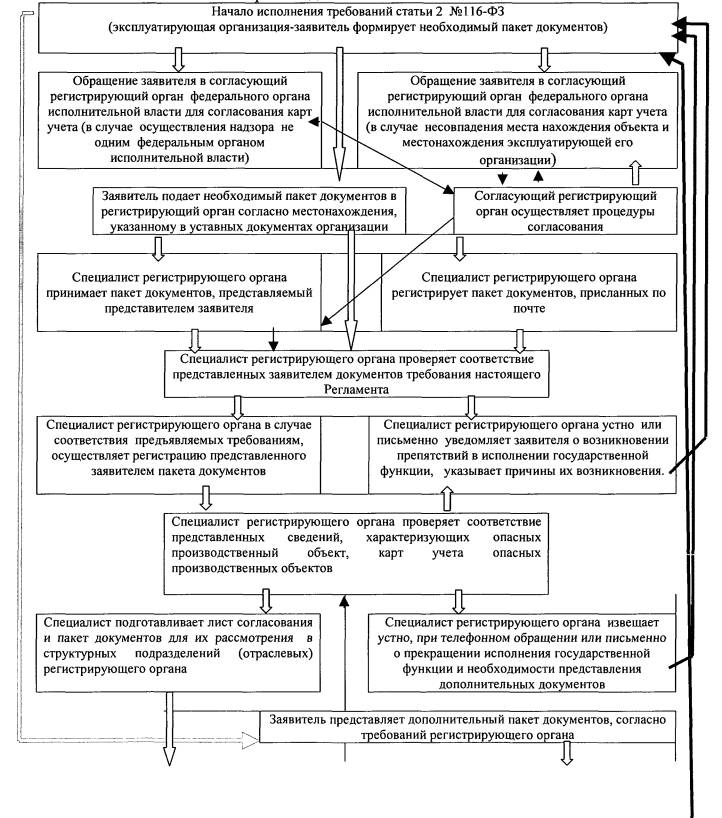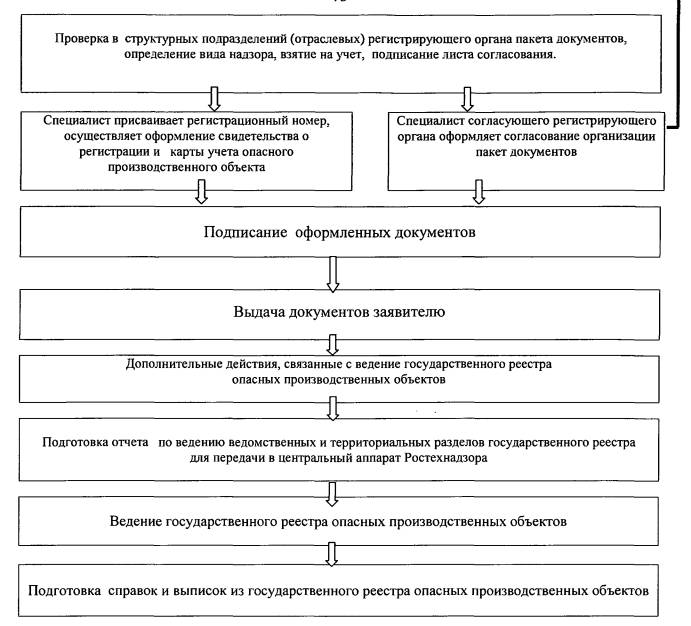 I. Общие положенияНаименование государственной функции 1. Настоящий административный регламент (далее - Регламент) Федеральной службы по экологическому технологическому и атомному надзору (далее - Ростехнадзор) определяет: порядок и сроки осуществления действий (административных процедур) при регистрации опасных производственных объектов и ведении государственного реестра опасных производственных объектов; порядок взаимодействия Ростехнадзора, ее территориальных органов, осуществляющих государственную функцию по регистрации опасных производственных объектов и ведению территориальных разделов государственного реестра опасных производственных объектов с иными федеральными органами исполнительной власти, которым предоставлено право регистрации подведомственных опасных производственных объектов и ведение ведомственных разделов государственного реестра опасных производственных объектов. 2. Регистрация опасных производственных объектов в государственном реестре и ведение государственного реестра опасных производственных объектов - государственная функция, проводимая для учета опасных производственных объектов и эксплуатирующих их организаций. 3. При исполнении этой функции осуществляется: - учет опасного производственного объекта; - присвоение регистрационного номера опасным производственным объектам и эксплуатирующим их организациям в государственном реестре опасных производственных объектов; - занесение в базу данных государственного реестра сведений об опасных производственных объектах и организациях, осуществляющих их эксплуатацию; - выдача регистрирующим органом утвержденной карты учета опасного производственного объекта; - выдача свидетельства о регистрации опасного(ых) производственного(ых) объекта(ов) эксплуатирующей организации; - накопление в базе данных государственного реестра опасных производственных объектов, его ведомственных и территориальных разделах систематизированных сведений об опасных производственных объектах и эксплуатирующих их организациях; - внесение в базу данных необходимых изменений; - хранение и анализ информации о зарегистрированных объектах. 4. Основные понятия, используемые в настоящем регламенте 4.1. Промышленная безопасность - состояние защищенности жизненно важных интересов личности и общества от аварий на опасных производственных объектах и последствий указанных аварий (ст. 1 Федерального закона от 21 июля 1997 г. N 116-ФЗ "О промышленной безопасности опасных производственных объектов"). 4.2. Государственный реестр опасных производственных объектов - реестр, в котором на основе единых методологических и программно-технологических принципов с использованием современных компьютерных технологий накапливается, анализируется и хранится систематизированная информация о зарегистрированных опасных производственных объектах и эксплуатирующих их организациях (п. 2 Правил регистрации объектов в государственном реестре опасных производственных объектов, утвержденными постановлением Правительства Российской Федерации от 24 ноября 1998 г. N 1371 "О регистрации объектов в государственном реестре опасных производственных объектов"). 4.3. Опасный производственный объект - предприятие или его цех, участок, площадка, а также иные производственные объекты, на кото