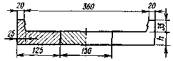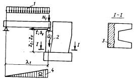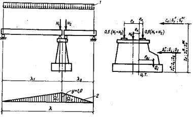 Рис. 1.1. Треугольно-прямоугольная линия влияния 1.8. Грузоподъемность опор в расчетных сечениях определяется с учетом постоянных и временных нагрузок, перечисленных в табл. 3.3 настоящего Руководства, включая прочие воздействия в виде ветровой и ледовой нагрузки и нагрузки от навала судов. Горизонтальные удары подвижного состава, так же как и при классификации пролетных строений мостов, не учитываются. 1.9. Расчетные сечения назначаются по обрезу и по подошве фундамента, а также в сечениях с резким изменением конфигурации или площади поперечного сечения. Промежуточные опоры рассчитываются в двух расчетных плоскостях: в плоскости продольной оси моста и в плоскости перпендикулярной к ней (поперечной фасаду моста); грузоподъемность устоев проверяют только в плоскости продольной оси моста. 1.10. Для определения грузоподъемности опор используют следующие исходные уравнения предельных состояний: по среднему давлению (на прочность кладки и несущую способность грунта): SNП + SNК = mnRA; (1.5) по максимальному давлению (для наиболее загруженной грани): (SNП + SNК)r + SMП + SMК = mnRW; (1.6) по положению равнодействующей относительно центра тяжести сечения с учетом ограничений эксцентриситета равнодействующей нагрузок (определяется только по подошве фундамента): (SNП + SNК)r'e = SMП + SMК; (1.7) по устойчивости положения против опрокидывания:
