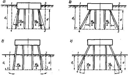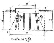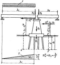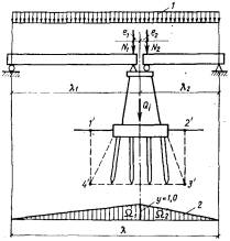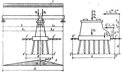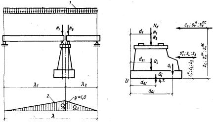 площадь линии влияния 6. определение грузоподъемности по грунту фундаментов из свай или опускных колодцев, как условного фундамента мелкого заложенияОбщие положенияНесущую способность основания в уровне низа свай или низа (ножа) опускного колодца требуется проверять как для условного фундамента согласно приложению 15. Грузоподъемность опор по грунту основания условного фундамента проверяют: по среднему давлению подошвы условного фундамента, при этом по максимальному давлению, с соблюдением условия В формулах (6.1) и (6.2): pcp, pтах - соответственно среднее и максимальное давление подошвы условного фундамента на основание; n - коэффициент надежности по назначению сооружения, принимаемый по п. 3.18 равным 0,72; т - коэффициент условий работы, определяемый по п. 3.19; R - расчетное сопротивление грунтового основания осевому сжатию, определяемое по приложению 3 или ориентировочно по табл. 2.3 и 2.4 и пп. 2.7 и 2.8 Расчет промежуточных опор по среднему давлению6.1. Расчетная схема загружения промежуточной опоры на свайном основании по среднему давлению (рис. 6.1) теоретически не отличается от схемы, приведенной на рис. 4.1 для расчета опор на естественном основании. Детальная схема условного грунтового фундамента с буквенными обозначениями приведена на рис. 6.2.