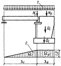 нагрузку в продольном направлении: Площади линий влияния нормальных сил и изгибающих моментов определяют по формулам: при загружении одного пролета при загружении двух пролетов При расположении на промежуточной опоре неподвижных