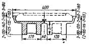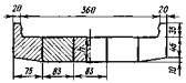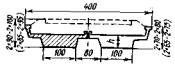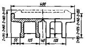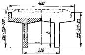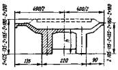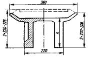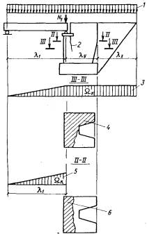 Примечание. Номера нагрузок без скобок соответствуют табл. 3.3, в скобках - СНиП 2.05.03-84. 3.23. Ветровая нагрузка (10) в сочетании с вертикальной поездной (6) учитывается с коэффициентом hk = 0,5. Во всех сочетаниях нагрузок коэффициент hk к нагрузкам 6-8 необходимо принимать одинаковым, а к нагрузке 9 - не более, чем к нагрузке 6. Нагрузки ледовая (11) и от навала судов (12) совместно не учитываются. 3.24. Приведенные в табл. 3.4 расчетные сочетания нагрузок предусматривают проверку грузоподъемности промежуточных опор и устоев против опрокидывания и сдвига по подошве фундамента, а все остальные виды расчета, кроме оценки прочности грунтового основания в уровне подошвы фундамента, включают проверку прочности кладки в поперечных сечениях с резким изменением конфигурации и площади. 4. ОПРЕДЕЛЕНИЕ ГРУЗОПОДЪЕМНОСТИ ПРОМЕЖУТОЧНЫХ ОПОРОбщие положенияГрузоподъемность промежуточных опор определяют: по среднему давлению; по максимальному давлению; по эксцентриситету приложения равнодействующей нагрузок с нахождением относительного эксцентриситета; по устойчивости против опрокидывания. Максимальное давление (у наиболее загруженной грани) определяют как в продольном, так и в поперечном направлении к оси моста, а эксцентриситет приложения равнодействующей в поперечном направлении к оси моста - только для двухпутных и многопутных опор, а также для опор с ледорезами. Все опоры по среднему давлению и симметричные однопутные опоры по эксцентриситету приложения равнодействующей рассчитывают только в продольном относительно оси моста направлении. Расчетные сопротивления кладки мостовых опор на порядок больше расчетных сопротивлений грунтов основания, поэтому при небольшой разнице площадей сечений по подошве и по обрезу фундамента классы по кладке можно не определять. Проверять грузоподъемность опор по прочности кладки необходимо лишь при значительном снижении расчетного сопротивления материала кладки и при наличии дефектов в виде вывалов камней, трещин и других разрушений, уменьшающих площадь сечения и изменяющих другие геометрические характеристики проверяемых поперечных сечений. Расчет опор со среднему давлению4.1. Расчетная схема промежуточной опоры (быка) по среднему давлению (рис. 4.1) предусматривает загружение временной вертикальной нагрузкой обоих опирающихся на нее пролетных строений. В расчет по среднему давлению вводят только вертикальные постоянные нагрузки и искомую временную нагрузку 6 (см. табл. 3.4), величину которой находят по формуле (1.10), в которой применительно к расчету промежуточной опоры, где