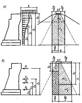 Для расчета устоя на опрокидывание, когда временной нагрузкой загружают только призму обрушения и удерживающие моменты от временных нагрузок отсутствуют, общая формула расчета опор на опрокидывание (1.12) принимает вид: