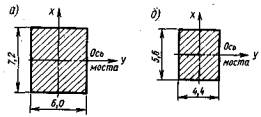 опоры для расчета по среднему давлению: В свою очередь ll = lp1 + eк1; l2 = lp2 + eк2, где eк1; eк2 - длина консолей продольных балок; lp1; lp2 - расчетный пролет пролетных строений, опирающихся на опору. Определение допускаемой нагрузки по прочности кладки Вычисляя допускаемую эквивалентную нагрузку по прочности кладки принимают: m - по табл. 2.1; п = 1,0 по п. 3.18; R - по табл. 2.1 с учетом климатического коэффициента по табл. 2.2; А - вычисляют по формулам приложения 2; ek – по п. 3.11. Определение допускаемой временной нагрузки по несущей способности основания (по подошве фундамента) При оценке несущей способности грунтового основания принимают: п = 0,72; m = 1,0 в соответствии с пп. 3.18 и 3.19; R - по табл. 2.3, 2.4 и приложению 3. Остальные величины принимаются такими же, как и в расчетах на прочность кладки. Расчет опор по максимальному давлению4.2. Грузоподъемность промежуточных опор по максимальному давлению определяют как в продольном, так и в поперечном направлении. Расчет в продольном направлении На