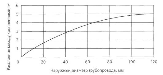 5.4.7 Для крепления трубопровода к конструкции здания применяют неподвижные и скользящие опоры, расстояния между которыми определяют расчетом (приложение Ж). В качестве неподвижных опор могут быть использованы держатели для труб, закрепленные на строительных конструкциях. 5.4.8 Выбор приближенных значений расстояний между креплениями трубопроводов из твердых медных труб следует проводить по номограмме, приведенной на рисунке 1.