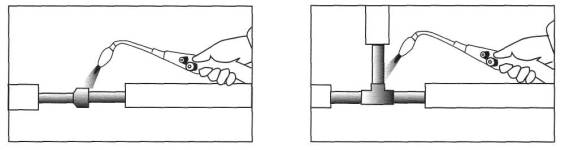 Рисунок 5 - Пайка раструбного соединения и тройника Особенность капиллярной пайки заключается в том, что припой вводится в капиллярный зазор в одной точке. Количество вводимого припоя примерно соответствует длине прутка, равного величине наружного диаметра трубы. Излишек введенного припоя характеризуется вытеканием капли расплавленного припоя из соединения. В зависимости от диаметра трубы используют несколько одновременно прикладываемых прутков или берут один большой пруток. При выполнении капиллярной пайки припой не нагревают, но следят за полным заполнением им зазора до края раструба. При пайке тройникового соединения следует соблюдать очередность проведения работ, указанную на рисунке 6.