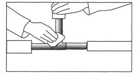 Рисунок 7 - Удаление влажной тряпкой излишков припоя После охлаждения соединения изолирующую оболочку возвращают обратно. 5.4.25 Твердую пайку осуществляют с использованием твердых припоев для соединения полутвердых и твердых медных труб с литьевыми фитингами из латуни и бронзы. Процедура пайки аналогична изложенной в 5.4.24 для мягкой пайки. 5.4.26 Сварку медных труб применяют для труб толщиной 1,5 мм и более и выполняют исключительно встык - по торцам, вкруговую. На кромках торцов труб фаски не снимают, кромки торца трубы должны быть перпендикулярными, между торцами свариваемых труб устанавливают зазор, равный толщине стенки трубы. Сварное соединение получают: - газовой сваркой с ацетилено-кислородной горелкой; - сваркой плавким электродом в аргоновой или гелиевой среде; - сваркой неплавким электродом, питаемым постоянным током, с подачей в зону электродуги сварного шва присадочного материала в виде проволоки или прутка, а также в защитной аргоновой или гелиевой среде. 5.4.27 Прессовое соединение медных труб осуществляют электрогидравлическими прессами с питанием от сети либо от устанавливаемых внутри аккумуляторных батарей напряжением 12 В с применением медных пресс-фитингов диаметром до 54 мм. Процедура обжатия включает: разведение обжимных цанг, введение их в зону собранного с трубой фитинга, смыкание цанг до полного соприкосновения их на фитинге, разведение цанг и освобождение инструмента. Процедуру обжатия повторяют поочередно на каждом прессовом соединении фитинга: два раза на пресс-угольниках, пресс-переходах и три раза на пресс-тройниках. При смыкании цанг на фитинге происходит равномерное круговое обжатие медного пресс-фитинга на трубе и фиксация эластичного уплотнителя. Конструкция пресса позволяет вращать обжимное цанговое устройство относительно рабочего положения пресса на угол до 270°. 5.4.28 Компрессионное соединение медных трубопроводов осуществляют наворачиванием на трубу накидной гайки с помощью гаечного или разводного ключа. Число оборотов, на которое следует поворачивать накидную гайку после ее накручивания вручную, зависит от состояния материала трубы и устанавливается в технической документации поставщика компрессионных фитингов. 5.4.29 При монтаже систем водоснабжения и отопления разрешается пользоваться только исправным инструментом и приспособлениями при обязательном соблюдении условий их эксплуатации. Гаечные ключи должны соответствовать размеру гаек и не иметь зазубрин и сбитой насечки. Губки ключей должны быть параллельными и не иметь трещин и выбоин. При монтаже следует пользоваться динамометрическими ключами. Нагревательные устройства и их элементы должны соответствовать установленным требованиям для производства соответствующих паечных работ. 6 Методы испытания внутренних систем трубопроводов6.1 По завершении монтажных работ монтажными организациями должны быть выполнены испытания систем отопления, хозяйственно-питьевого и горячего водоснабжения на герметичность, а также промывка систем. Применяемые для испытаний манометры должны быть проверены в соответствии с требованиями ГОСТ 8.002. 6.2 Системы внутреннего хозяйственно-питьевого и горячего водоснабжения должны быть испытаны гидростатическим или манометрическим методом с соблюдением требований ГОСТ 25136. 6.3 Испытания гид