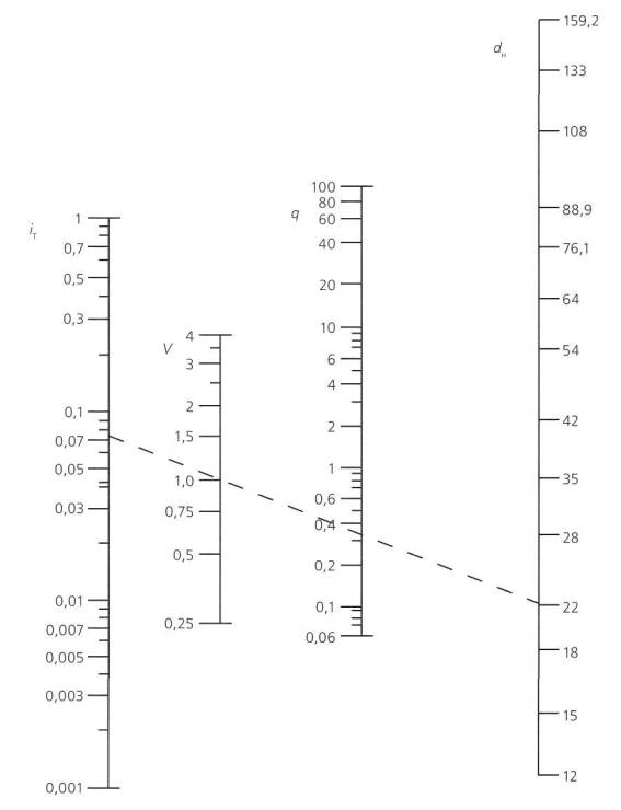 Обозначения: iт - потери давления на трение по длине, Па/м; V - скорость, м/с; q - расход, л/с; dн - наружный диаметр трубы, мм