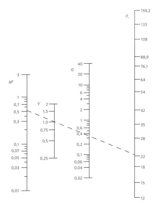 Обозначения: ΔР - потери давления, кПа/м; V - скорость, м/с; G - расход теплоносителя, кг/с; dн - наружный диаметр трубы, мм