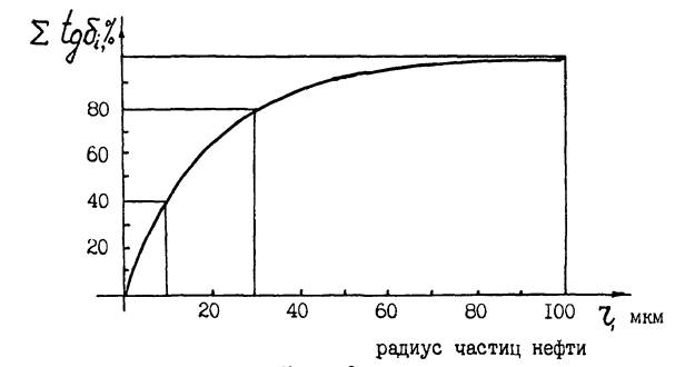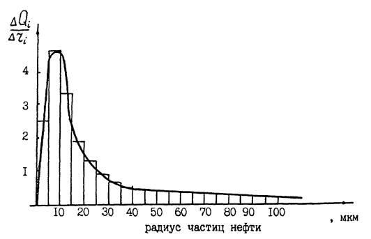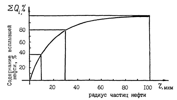 2.5.8. Построить зависимость размера частиц нефти (ось абсцисс) от суммарного содержания фракций (ось ординат), выражающую распределение по размерам частиц всплывшей нефти (черт. 3). 2.5.9. По графику (черт. 3) определить величину приращения DQi содержания частиц нефти в процентах через равные интервалы размера радиуса Dri . Результаты записать в табл.3. Таблица 3.
