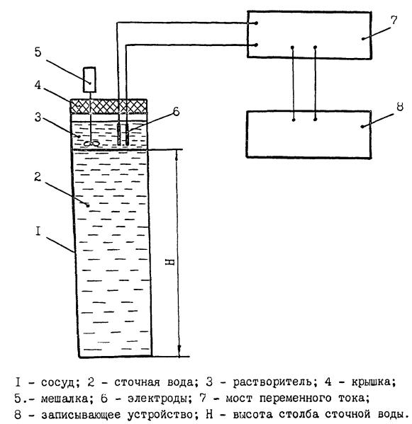 3.2. Аппаратура, материалы, реактивы 3.2.1. Для определения размера частиц эмульгированной нефти используют лабораторную установку, схема которой приведена на черт. 5. В качестве диэлькометра могут быть использованы приборы для измерения диэлькометрических характеристик с классом точности не ниже 1,5. Электроды плоской формы должны быть изготовлены из меди по ГОСТ 859-78, латуни - по ГОСТ 17711-80 или нержавеющей стали - по ГОСТ 5632-72. Рабочие поверхности должны быть равные и иметь шероховатость поверхности (Rа) не более 32 мкм по ГОСТ 2789-73. Рабочие поверхности электродов допускается никелировать, серебрить, хромировать. Электроды должны быть смонтированы так, чтобы их концы располагались в одной горизонтальной плоскости и сохраняли первоначальное положение относительно друг друга. Зазор между электродами должен составлять 2,5±0,1 мм. Поверка зазора должна осуществляться шаблоном-калибром. Измерительная ячейка - сосуд для анализируемой пробы. Сосуд для жидкости должен быть изготовлен из материала, который не растворяется в применяемых растворителях, из стекла, кварца, электроизоляционной пластмассы. В качестве сосуда может быть использован мерный цилиндр. Конструкция крышки измерительной ячейки должна обеспечивать возможность быстрого и простого демонтажа для промывки электродов, их полировки, а также юстировки зазора между электродами при повторном монтаже электродов. 3.2.2. Прочие материалы Секундомер, класс точности 2 - по ГОСТ 5072-79. Набор ареометров со шкалой измерений от 800 до 1200 кг/м3 - по ГОСТ 18481-81E. Вискозиметр ВПЖ-2 (диаметром 0,62 мм) - по ГОСТ 10028-81. Склянка с тубусом емкостью 2000 мл - по ГОСТ 25336-82. Цилиндр мерный на 50, 500 мл - по ГОСТ 1770-74E Толуол, ч.д.а. - по ГОСТ 5789-78. 3.3. Подготовка к анализу 3.3.1. Собрать лабораторную установку в соответствии с черт. 5. Установка состоит из сосуда 1, вместимостью 400-500 мл, в который заливают анализируемую пробу сточной воды 2. В сосуд вставляют крышку 4 с электродами 6, которые по высоте должны быть на 2-3 мм ниже уровня растворителя 3. Укрепить перемешивающее устройство 5. Электроды подсоединить к мосту переменного тока 7, при необходимости подсоединить записывающее устройство 8. 3.3.2. Определить характеристические параметры исследуемой сточной воды для расчета константы "К" уравнения Стокса по формуле (1). 3.3.3. Определить расчетный радиус частиц нефти, всплывших за определенное время отстоя в сосуде 1 по формуле (2), где Н - высота столба сточной воды в сосуде 1. 3.3.4. Расчеты, выполненные по пп. 3.3.3, записать в табл.4. Таблица 4.