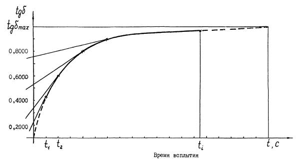 Черт. 5. Схема лабораторной установки измерения размера частиц эмульгированной нефти 3.4.1. Отобрать пробу сточной воды в склянку с нижним тубусом. 3.4.2. Включить секундомер. 3.4.3. Залить пробу в сосуд I. 3.4.4. Залить медленно 50 мл толуола в сосуд I. 3.4.5. Включить мешалку, число оборотов в минуту - 40-60. 3.4.6. Через выбранные интервалы времени зафиксировать значения тангенса угла диэлектрических потерь (tg(D)) нажатием на кнопку tg(D) диэлькометра либо выбрать автоматический режим показаний и времени анализа ti. В начале анализа отсчеты производить через каждые 20-30 с. По мере приближения анализа к концу интервал времени между снятием отсчета постепенно увеличивать. 3.4.7. По истечении 50-60 мин., снять крышку с электродами, сосуд закрыть притертой либо другой подогнанной пробкой и несколько раз осторожно перевернуть вверх дном с тем, чтобы полностью проэкстрагировать эмульгированную нефть в пробе. Дать отстояться пробе до четкой границы раздела фаз. Измерить значение тангенса угла диэлектрических потерь всей всплывшей эмульгированной нефти - tg(Dmax) 3.5. Обработка результатов 3.5.1. Построить основной график накопления эмульгированной нефти от времени: ось ординат - значения тангенса угла диэлектрических потерь всплывшей нефти, ось абсцисс - время накопления (на черт. 6, сплошная линия). 3.5.2. Достроить график накопления: 1) от начала координат до значения tg(D) соответствующего времени начала анализа t1; 2) кривую накопления продолжить до пересечения с прямой, соответствующей максимальному значению tg(Dmax) (черт. 6). 3.5.3. Разбить кривую накопления на ряд фракций, соответствующих времени накопления t1, t2, ... ti, и провести касательные в этих точках до пересечения с осью ординат.