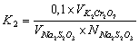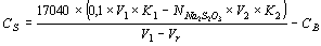 где N Na2S2O3 - нормальность титрованного раствора тиосульфата натрия, использовавшегося при основном определении; V1 - количество прибавленного раствора йода, мл; К1 - поправочный коэффициент для приведения концентрации раствора йода к точному значению; V2 - количество раствора тиосульфата натрия, израсходованного на обратное титрование, мл; К2 - поправочный коэффициент для приведения концентрации раствора тиосульфата натрия к точному значению; V l - суммарное количество жидкости (с учетом консерванта), залитой в емкость при отборе пробы, мл; V r - количество прибавленного раствора консервирующего реагента (ацетата кадмия), мл; С в - величина, соответствующая поправке к величине С s вычисляющаяся в случае проведения холостого определения.