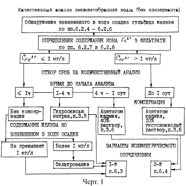 Величина 9. Требования безопасности9.1. Общие требования по безопасному ведению работ на месторождениях, в газе которых объемное содержание сероводорода не превышает 6%, должны соответствовать "Инструкции по безопасности работ при разработке нефтяных, газовых и газоконденсатных месторождений, содержащих сероводород", утвержденной Госгортехнадзором СССР 5 декабря 1977 г. Свойства и действие сероводорода на человека, оказание доврачебной помощи пострадавшим при отравлении сероводородом, приборы для контроля концентрации и средства индивидуальной защиты приведены в приложениях 1, 2, 3 и 5 "Инструкции по безопасности работ при разработке нефтяных, газовых и газоконденсатных месторождений, содержащих сероводород", утвержденной Госгортехнадзором СССР 5 декабря 1977 г. 9.2. На месторождениях, где объемное содержание сероводорода в газе превышает 6%, следует принимать дополнительные меры предосторожности согласно "Инструкции по безопасному ведению работ при разведке и разработке нефтяных, газовых и газоконденсатных месторождений с высоким содержанием сероводорода и других вредных и агрессивных веществ", утвержденной Госгортехнадзором СССР 17 июня 1982 г. 9.3. Лица, занимающиеся отбором проб, должны пройти специальный инструктаж. 9.4. Все работы, проводимые в химических лабораториях, должны осуществляться в соответствии с "Основными правилами работы в химических лабораториях". - М.: Химия, 1979 г. - 88 с. 9.5. Категорически запрещается получение газообразного сероводорода вне вытяжного шкафа или в условиях неисправной работы вентиляции. 9.6. Следует помнить, что реактив А содержит серную кислоту. Изменением N 1, утвержденным приказом Министерства нефтяной и газовой промышленности СССР от 6 июня 1990 г. N 256 в настоящее приложение внесены изменения, вступающие в силу с 1 ноября 1990 г. Приложение 1(обязательное) Схема анализа воды при суммарном содержании сероводорода и его ассоциатов по текущим анализам более 5 мг/л(с изменениями от 6 июня 1990 г.)