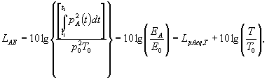 где p2A(t) - квадрат мгновенного корректированного по частотной характеристике А (далее - корректированное по А) звукового давления как функция текущего времени t; t1 и t2 - начало и конец интервала интегрирования (11.1.1). 3.5 уровень воздействия шума LAE дБА (Л-weighted sound exposure level): Величина, представляющая собой десятикратный десятичный логарифм отношения воздействия шума ЕА к опорному значению воздействия Е0, равному произведению квадрата опорного звукового давления р0 = 20 мкПа на опорную продолжительность воздействия шума T0 = 1 с (Е0 = р02 Т0 = 4·10-10 Па2·с). Примечания 1 Уровень воздействия шума за время определенного события (например, за время рейса судна) продолжительностью Т = t2 – t1, с, выражают через эквивалентный уровень звука LpAeq,T no формуле