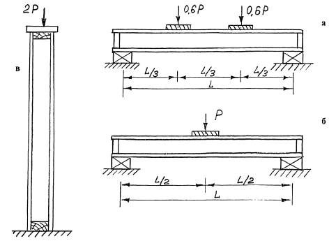 а, б - приложение нагрузок при испытаниях на поперечный изгиб; в - приложение нагрузок при испытаниях на вертикальную нагрузку на кромку панели Рисунок 3 - Схемы приложения нагрузок при испытаниях панелей на поперечный изгиб и вертикальную нагрузку на кромку панели 4.5.2 Для каждого вида испытаний отбирают не менее 2 образцов панелей, отвечающих требованиям настоящих технических условий (отобранных из партии панелей, принятых техническим контролем изготовителя). 4.5.3 Нагрузку