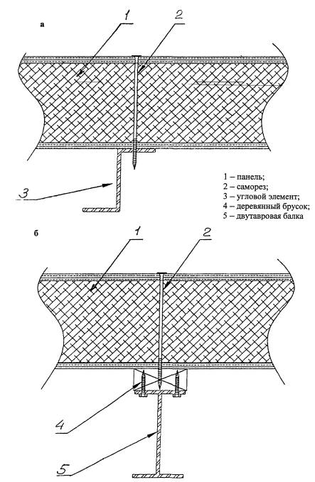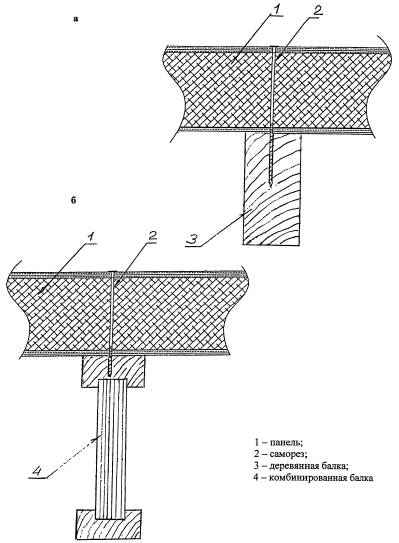 Рисунок Б.1 - Примеры крепления панелей покрытия (перекрытия) к деревянной (а) и комбинированной балке (б)