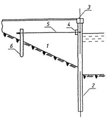 Рисунок 1 - Шпунтовая стенка из ПШС с анкерным креплением 1 - массив грунта; 2 - ПШС; 3 - шапочный брус; 4 - распределительная балка; 5 - анкерная тяга; 6 - анкерная свая.