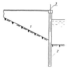 Рисунок 2 - Шпунтовая стенка из ПШС 1 - массив грунта; 2 - свая ПШС; 3 - шапочный брус. 5.4 ПШС рекомендуется складировать на строительной площадке вблизи места погружения, без кантования при строповке. Число рядов ПШС, уложенных в штабель на заводских транспортных планках-прокладках, не должно превышать десяти. 5.5 Допускается хранение ПШС, анкерных тяг и свай на открытом воздухе. 6 Приемка и подготовка ПШС к погружению6.1 Каждая партия ПШС, поступающая на строительство, должна сопровождаться документацией согласно ГОСТ 7566 и ТУ 5264-006-01393674. При приемке ПШС следует проверять соответствие паспортных данных требованиям проектной документации и настоящего Стандарта и иметь сертификаты соответствия согласно требованиям Федерального Закона «О техническом регулировании» (№ 184-ФЗ, глава 4). 6.2 Документ (паспорт) о качестве ПШС должен содержать: - обозначение ПШС; - номер паспорта и дату его составления, информацию о марке стали; - тип антикоррозийного покрытия и его характеристики, с указанием срока годности; - число поставленных изделий; Паспорт должен быть подписан начальником ОТК или другим ответственным представителем завода - изготовителя. К документу (паспорту) о качестве прилагаются: - исполнительные чертежи отгружаемых изделий; - ведомость документов о качестве материалов; - копии или № дипломов (удостоверений) о квалификации сварщиков и газорезчиков, изготавливавших ПШС; - ведомость контроля качества сварных швов. 6.3 При производстве сварных работ с шпунтом ПШС на строительной площадке следует применять сварочные материалы в соответствии с указаниями проекта, СНиП II-23 и настоящего Стандарта организации. 6.4 У всех ПШС на этапе приёмки должны быть проверены форма замка, его прямолинейность и чистота поверхности. Внутреннюю поверхность замков рекомендуется очищать протаскиванием отрезка соответствующего замкового элемента ПШС (кулачка или обоймы) длиной не менее 2 м. Выправление изгибов и вмятин замков разрешается на длине не более 100 см и не более одного выреза на шпунтину, с последующей приваркой на этом месте, после тщательной выправки основной полосовой стенки, качественного замкового элемента. При производстве ремонтных работ сварочные соединения и заменяемые замковые элементы по прочности и коррозионной стойкости должны быть не ниже заводских. Отклонения размеров отремонтированных замков не должны превышать допускаемые значения, указанные в ТУ 5264-006-01393674-01. 6.6 Перед погружением ПШС срезают все заводские транспортные поперечные планки-прокладки. Рекомендуется также срезать на длине примерно 100 мм со скосом на конце 30-40° кулачок верхнего конца ПШС. 6.7 ПШС длиной до 30 м подают на площадку в соответствии с ТУ 5264-006-01393674-01. При длине более 30 м ПШС стыкуют в соответствии с требованиями проектной документации и настоящего Стандарта организации, обеспечивая условия грунтонепроницаемости и равнопрочности стыка и основного профиля. 6.8 Сварные соединения ПШС на строительной площадке следует выполнять в соответствии с требованиями ГОСТ 5264-80 и ГОСТ 14771-76. 6.9 Расстояние между стыками двух соседних ПШС после забивки в зоне с рабочими напряжениями более 50 % от предельных должно быть не менее 2 м. 6.11 При погружении ПШС в крупнообломочный и полускальный грунты следует применять шпунт с утолщенной полкой и стенкой на нижнем конце или усилив