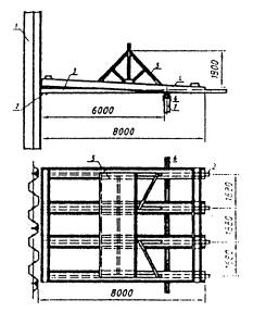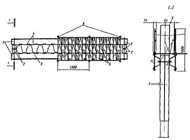 Рисунок 3 - Инвентарные подмости-кондуктор для забивки ПШС 1 - направляющие шпунтины; 2 - маячные сваи; 3 - забитая ПШС; 4 - деревянные предохранители; 5 - деревянные подмости; 6 - перильное ограждение; 7 - крепление направляющих.