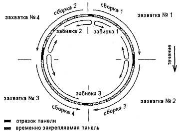 з) набор краном по аналогии с пунктом в) всех панелей на захватке № 4 против хода часовой стрелки, начиная с последней панели, примыкающей к первой панели на захватке № 1, за исключением второй панели захватки № 4, примыкающей к закрепленному отрезку панели, установленному согласно пункта ж) на месте первой панели захватки № 4;