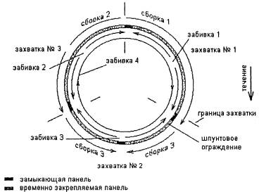 к) срезка крепления первой панели на захватке № 1 и ее забивка вместе с набранными панелями на захватке № 4 несколькими последовательными проходками от середины к краям на проектную глубину, за исключением второй панели, примыкающей к закрепленному панельному отрезку, которая забивается только лишь на одну проходку глубже панельного отрезка и временно закрепляется сваркой к верхнему распорному кольцу;