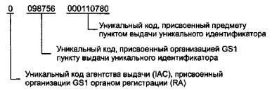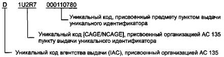 Рисунок А.2 - Уникальный идентификатор предметов, присваиваемый в рамках организации АС 135 Вышеуказанный уникальный идентификатор может быть представлен в виде символа штрихового кода Code 128 или на ином носителе данных автоматической идентификации и сбора данных с использованием идентификатора данных 25S. При сканировании символа штрихового кода на вход компьютерной системы будет передана строка данных, указанная в таблице А.2. Таблица А.2 - Строка данных, установленная организацией АС 135