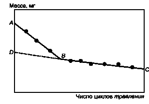 образцы. По взвешиванию контрольного образца до и после травления (взвешивание проводят с точностью до Для определения потери массы металла контрольных образцов проводят контрольное травление на образцах, не подвергавшихся коррозионным испытаниям. Количество контрольных образцов - не менее трех. Перед травлением контрольные образцы выдерживают в эксикаторе с влагопоглотителем в течение 24ч и взвешивают. На одном и том же контрольном образце проводят травление в определенном растворе и при определенном режиме (приложение Б) три раза. После каждого травления определяют величину потери массы контрольного образца. Вычисляют среднеарифметическое значение потери массы контрольного образца в результате трех травлений. Потерю массы контрольных образцов учитывают при определении коррозионных потерь. После удаления продуктов коррозии с поверхности прокорродировавшего испытуемого образца операцию его травления повторяют несколько раз. Строят график зависимости потери массы образца от числа равных циклов травления (рисунок 1), где точка А представляет массу прокорродировавшего образца до начала удаления продуктов коррозии (травления). В большинстве случаев будет иметь место линейная зависимость значений массы образца, полученных в циклах травления (после удаления продуктов коррозии), от числа циклов его травления. Получают две линии АВ и ВC. Линия АВ характеризует удаление продуктов коррозии и может быть не всегда видима. Линия ВС характеризует удаление основного металла после того, как удалены продукты коррозии. Экстраполяцией линии ВС на ось ординат мы получим точку D, которая характеризует массу образца при нулевом количестве циклов удаления продуктов коррозии (травления). В некоторых случаях зависимость может быть нелинейной и тогда следует сделать наиболее приемлемую экстраполяцию.