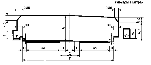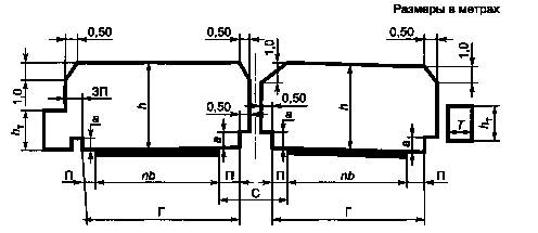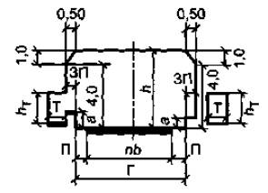 в - с разделительной полосой при наличии ограждения ЗП - ширина защитных полос; hT - габарит по высоте на тротуарах; Т - ширина тротуаров; а - высота ограждений; h - габарит по высоте на проезжей части; П - ширина полосы безопасности; nb - общая ширина проезжей части или ширина проезжей части для движения одного направления (n - число полос движения в одном направлении, b - ширина каждой полосы движения, м), м; Г - габарит по ширине (расстояние между ограждениями проезда, в которое входит и ширина разделительной полосы, не имеющей ограждений); С - ширина разделительной полосы, м. Рисунок 2 - Схемы габаритов приближения конструкций на автодорожных мостах и путепроводах (Поправка, ИУС 9 2008 г.). 6.2. Габарит по высоте на проезжей части мостов и путепроводов на автомобильных дорогах (расстояние от поверхности проезда до верхней линии очертания габарита) должен быть, м, не менее: - на автомобильных дорогах категорий IA, 1Б, 1В, II, III - 5,0; - на автомобильных дорогах категорий IV - V - 4,5. Габарит по высоте на тротуарах должен быть - Категории автомобильных дорог - по ГОСТ Р 52398. 6.3.