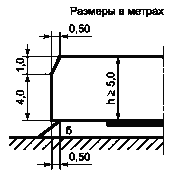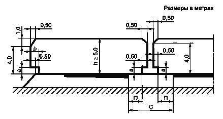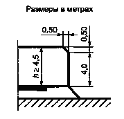 в - при наличии опор на разделительной полосе и ограждений на дороге Рисунок 3 - Схемы габаритов приближения конструкций под путепроводами 6.10. Расстояния от бровки земляного полотна пересекаемой дороги до передней грани необсыпных устоев или конуса насыпи при обсыпных устоях должны быть не менее указанных в таблице 2. Таблица 2 Размеры в метрах