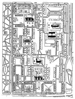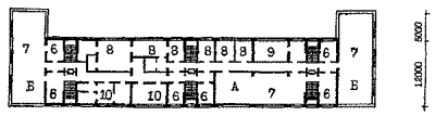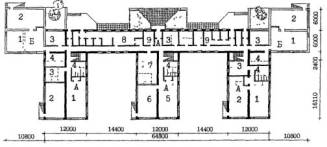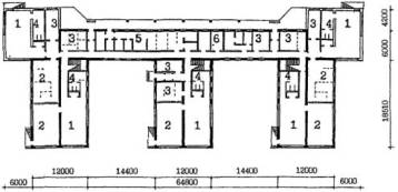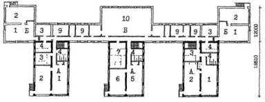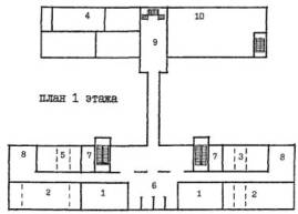 Примечания: 1. Площади помещений приняты с учетом сохранения планировочной и конструктивной структуры здания и пониженной высоты этажей в 2,8 м, требующей компенсации за счет увеличения площади помещений. 2. Переходный коэффициент отношения общей площади к расчетной принят 1,29 на основе показателей типового проекта 2МГ-04-3. 6. ПРИМЕРЫ АРХИТЕКТУРНО-ПЛАНИРОВОЧНЫХ РЕШЕНИЙ РЕКОНСТРУКЦИИ ЗДАНИЙ ШКОЛ И ДОШКОЛЬНЫХ УЧРЕЖДЕНИЙ ДЛЯ РАЙОНА ХОРОШЕВО-МНЕВНИКИ, КВАРТАЛ 81Примеры архитектурно-планировочных решений, представленные в данных Рекомендациях являются одним из возможных, вариантов реконструкции зданий школ и дошкольных учреждений и приведены в качестве иллюстративного материала к основным положениям Рекомендаций. Примеры решений демонстрируют объемы реконструкции существующих зданий, дополнительных пристроек к ним, а также возможности их размещения на существующих участках. Решения выполнены в соответствии с положениями данных Рекомендаций и действующими нормами и правилами, на основе ориентировочных составов и площадей помещений (табл. 7, 8 и 9), с учетом рекомендуемых типологических схем перепланировки и использования существующих зданий реконструируемых школ и дошкольных учреждений (рис. 4 - 9). Во всех вариантах предусмотрена возможность автономного использования клубно-спортивных помещений. 6.1. Реконструкция здания школы типа МЮ для размещения полной средней школы на 33 класса с наполняемостью класса в 30 учащихся - 990 мест (рис. 11, 16 - 19).6.1.1. В существующем 5-ти этажном здании школы размещаются учебные кабинеты и лаборатории 5 - 11 классов с перепланировкой основных помещений. На первом этаже размещены вестибюль, административные помещения и часть мастерских. 6.1.2. В существующем зальном блоке-пристройке предусматриваются мастерские, в новом 3-х этажном блоке-пристройке с габаритами 1870´46.2 м размещаются классы начальной школы. Связь блоков осуществляется по первому этажу. 6.1.3. Новый клубно-спортивный блок-пристройка с габаритами 33.0´54.0 м объединяется с учебным блоком остекленной галереей и рекреацией по первому этажу. На 1-ом этаже размещены столовая библиотека, клубные помещения. На 2-ом этаже - двухсветные актовый и спортивный залы. 6.2. Реконструкция здания школы типа МЮ для размещения полной средней школы на 33 класса с наполняемостью классов в 25 учащихся - 825 мест (рис. 11 - 15).6.2.1. В существующем 5-ти этажном корпусе школы полностью размещаются все учебные помещения 5-11 классов с минимальной перепланировкой по этажам. В существующем зальном блоке-пристройке запроектированы мастерские. 6.2.2. Клубно-спортивный и учебный блоки начальной школы связаны с основным зданием по первому этажу и рекреацией с зимним садом. 6.3. Реконструкция здания школы типа 65-426.1 для размещения полной средней школы на 33 класса с наполняемостью классов в 30 учащихия - 990 мест (рис. 20, 25 - 28).6.3.1. К существующему зданию школы пристраиваются три блока, и надстраивается учебный корпус до 4-х этажей. В учебном корпусе располагаются все учебные кабинеты 5 - 11 классов, административные помещения. Осуществляется перепланировка основных помещений. Существующие актовый и спортивный зал используются как малый зал хореографии и физкультурный зал для начальных классов. 6.3.2. Актовый зал предусматривается в блоке-пристройке на месте перехода. Спортивный зал (24´12 м) пристраи