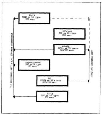 Рис. 6 Типологические схемы перепланировки и использования помещений существующего здания школы типа 65-426.1 для проектируемой школы на 33 класса (825 учащихся)