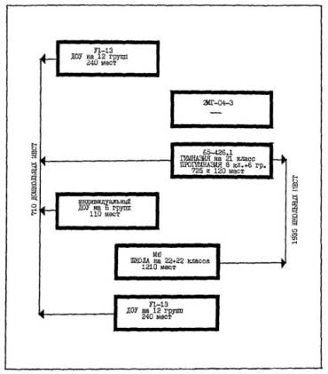 Рис. 2 Модель 1 организации сети образовательных учреждений в квартале 81 Хорошево-Мневники (см. табл. 5). Схема распределения мест по типам школьных и дошкольных образовательных учреждений, проектируемых на основе реконструкции существующих зданий школ и детских садов. ОРГАНИЗАЦИЯ СЕТИ И РАСЧЕТ ВМЕСТИМОСТИ ОБРАЗОВАТЕЛЬНЫХ УЧРЕЖДЕНИИ В КВАРТАЛЕ 81 ХОРОШЕВО-МНЕВНИКИ ПО МОДЕЛИ 1.
