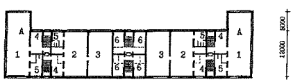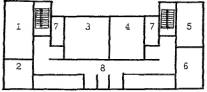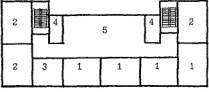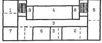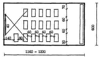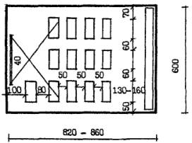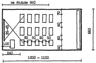 4.22. В детском саду типа VI-13, реконструируемом на 10 групповых ячеек (200 мест) (рис. 8), в существующем объеме могут быть предусмотрены помещения расчетной площадью 1361 кв. м. В дополнительные объемы выносятся помещения расчетной площадью 837 кв. м для ДЗВИ или 648 кв. м для ДОУ, в т. ч. четыре ячейки для групп или классов, универсальный зал, часть административных и служебно-бытовых помещений. 4.23. В детском саду типа 2МГ-04-3, реконструируемом на 10 групповых ячеек (200 мест) (рис. 9), в существующем объеме по схеме запланированы помещения расчетной площадью 1779 кв. м. В дополнительных объемах могут размещаться залы по 95 кв. м. 4.24. Для проверки соответствия реконструируемых помещений требованиям учебно-воспитательного процесса и санитарно-гигиенических норм целесообразно выполнять предварительные схемы расстановки мебели в основных учебных помещениях. Примеры схем классов различной конфигурации, организуемых в соответствии с данными рекомендациями в существующих объемах реконструируемых зданий школ и дошкольных учреждений (рис. 10), показывают, что, несмотря на нестандартные габариты или заниженные площади помещений, расстановка мебели в них может быть осуществлена в соответствии с действующими нормами. В групповых детских садов типа VI-13 с глубиной помещений 5.6 м при организации классов рекомендуется один из рядов формировать из одноместных учебных столов. В существующих школьных классах площадью 48 - 53 кв. м размещаются 12 - 13 двухместных учебных столов для 25 учащихся, а классах площадью 70 кв. м, организуемых при перепланировке существующих зданий школ, размещаются 15 двухместных учебных столов для 30 учащихся. 1