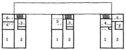 Рис. 10 Примеры расстановки мебели в учебных классах реконструируемых зданий школ и дошкольных учреждений: 1 - класс на 25 учащихся в здании детского сада типа VI-13, реконструируемого для ДЗВИ; 2 - класс на 25 учащихся в зданиях школ типа МЮ и 65-426.1, реконструируемых для школ на 33 класса; 3 - класс на 30 учащихся в зданиях школ типа МЮ и 65-426.1, реконструируемых для школ на 33 класса. 5. ОРИЕНТИРОВОЧНЫЕ СОСТАВЫ И ПЛОЩАДИ ПОМЕЩЕНИЙ ОБРАЗОВАТЕЛЬНЫХ УЧРЕЖДЕНИЙ ДЛЯ РЕКОНСТРУКЦИИ ЗДАНИЙ ШКОЛ ТИПОВ МЮ И 65-426 И ДОШКОЛЬНЫХ УЧРЕЖДЕНИЙ ТИПОВ VI-13 И 2МГ-04-3.5.1. Ориентировочные составы и площади помещений для реконструкции зданий школ МЮ и 65-426.1 и дошкольных учреждений VI-13 и 2МГ-04-3 (табл. 7, 8 и 9) разработаны по Модели 1 на примере типологических решений реконструкции сети и зданий школ и ДУ в кв. 81 Хорошево-Мневники. 5.2. Составы и площади помещений разработаны с учетом типологических схем перепланировки и использования существующих зданий указанных выше типов школ и ДУ (рис. 4 - 9). 5.3. Состав и площади помещений школы на 33 класса разработаны для вместимости 825 учащихся /по 25 учащихся в классе/ и для вместимости 990 учащихся /по 30 учащихся в классе/ и предусматривают возможность использования ряда помещений с пониженной площадью в их исходном проектном назначении (табл. 7). Для вместимости 825 учащихся даны два варианта площадей помещений: 1 - с выносом начальной школы в дополнительные объемы; 2 - с выносом учебных кабинетов основной и старшей школы в дополнительные объемы. Площади учебных помещений, расположенных в существующем здании принимаются пониженными в соответствии с существующей планировкой классов, площади учебных помещений в дополнительных объемах принимаются аналогично Приложению 27 к МГСН 4.06-96. Для вместимости 990 учащихся дан один вариант площадей учебных помещений в соответствии с нормами вне зависимости, от их расположения. ОРИЕНТИРОВОЧНЫЙ СОСТАВ И ПЛОЩАДИ ПОМЕЩЕНИЙ ДЛЯ РЕКОНСТРУКЦИИ ЗДАНИЙ ШКОЛ ТИПОВ МЮ И 65-426.1 (ПОЛНАЯ СРЕДНЯЯ ШКОЛА НА 33 КЛАССА - 825 И 990 УЧ-СЯ)