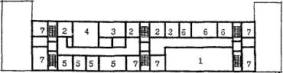 Примечания: 1. Увеличенные площади помещений приняты с учетом компенсации пониженной высоты этажей существующего здания. 2. Переходный коэффициент отношения общей площади к расчетной площади принят 1.22 на основе показателей типового проекта VI-13. 3. ДЗВИ в зависимости от условий может использоваться как ДОУ на десять групп, или дошкольно-школьное ОУ на пять групп и четыре класса, или начальная школа на восемь классов. ОРИЕНТИРОВОЧНЫЙ СОСТАВ И ПЛОЩАДИ ПОМЕЩЕНИЙ ДЛЯ РЕКОНСТРУИРУКЦИИ ЗДАНИЯ ДЕТСКОГО САДА ТИПА 2МГ-04-3 (ДОШКОЛЬНОЕ ОБРАЗОВАТЕЛЬНОЕ УЧРЕЖДЕНИЕ КОМБИНИРОВАННОГО ВИДА НА 10 ГРУПП - 200 МЕСТ)