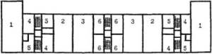 4. ВАРИАНТЫ ПЕРЕПЛАНИРОВКИ И ИСПОЛЬЗОВАНИЯ ЗДАНИЙ ШКОЛ ТИПОВ МЮ И 65-426.1, ДОШКОЛЬНЫХ УЧРЕЖДЕНИЙ ТИПОВ VI-13 И 2МГ-04-3, ОПРЕДЕЛЕНИЕ СОСТАВА ПОМЕЩЕНИЙ ДОПОЛНИТЕЛЬНЫХ ОБЪЕМОВ.4.1. В целях определения характера перепланировки существующего здания и выявления ориентировочного состава помещений и расчетных площадей помещений, выносимых в дополнительные объемы, целесообразно разрабатывать типологические схемы перепланировки и использования помещений существующего объема. Вне зависимости от последующих объемно-планировочных решений, надстраивания или пристраивания дополнительных объемов, существующие объемы предполагают определенную расчетную площадь размещаемых в них функциональных групп помещений. Состав существующих и дополнительных объемов может варьироваться. Типологические схемы следует разрабатывать на определенный вариант перепланировки, чтобы до разработки проекта и архитектурно-планировочных решений сформировать типы дополнительных блоков, определить их расчетные и общие площади. 4.2. В качестве примера в данных рекомендациях предлагается один из возможных вариантов перепланировки зданий образовательных учреждений в соответствии с МОДЕЛЬЮ 1 (рис. 4 - 9). 4.3. Для реконструкции зданий школ типов МЮ и 65-426.1 под полные средние школы на 33 класса с наполняемостью классов в 30 учащихся /990 мест/ требуется демонтаж части перегородок при организации учебных помещений площадью 70 м2 (рис. 5 и 7). Типологические схемы позволяют определить назначение образующихся при этом незапланированных помещений нестандартной площади. 4.4. Предлагаемые варианты типологических схем предусматривают размещение в существующих объемах зданий школ учебных групп помещений преимущественно основной и старшей школ. Начальная школа в данных вариантах выносится в дополнительные объемы. 4.5. При осуществлении надстройки учебного блока в здании школы типа 65-426.1 до 4-х этажей начальная школа может размещаться в основном надстроенном здании, однако, для простоты расчетов в типологической схеме помещения начальной школы методически обосновано отнести к дополнительным помещениям. Это не исключает возможности разработки варианта типологических схем с непосредственным размещением начальной школы в существующем здании, поскольку в любом случае эти помещения располагаются в пределах трех существующих этажей. 4.6. Выбор той или иной схемы зависит от принятой типологической методики. Вариант схемы с вынесением начальной школы в дополнительные объемы ориентирован на те случаи, когда надстраивание учебного блока реконструируемого здания школы типа 65-426.1 исключено. 4.7. В зданиях школ типа МЮ буфеты, актовые и спортивные залы не соответствуют требованиям МГСН к данным помещениям в школах на 33 класса. Предлагается проектирование спортивных, зрительных залов и столовых в дополнительных объемах (с отдельным входом) и изменение назначения аналогичных существующих помещений. 4.8. В зданиях школ типа 65-426.1 гимнастические и актовые залы по габаритам и площадям несколько отличаются от требуемых сегодня для школ на 33 класса, но в целях минимизации площадей дополнительных объемов с некоторыми дополнениями могут использоваться по своему назначению. Предлагаются решения с различными комбинациями залов: - на площади гимнастического - зала располагается спортивный