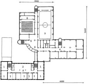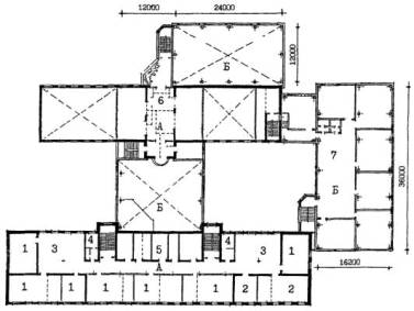 - существующее здание; Б - пристраиваемые объемы 1 - класс начальной школы;