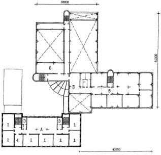 Рис. 13 Пример архитектурно-планировочного решения реконструкции здания школы типа МЮ для школы на 33 класса 825 учащихся. План 2 этажа А - существующее здание; Б - пристраиваемые объемы