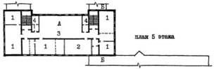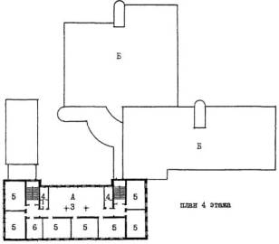 Рис. 23 Пример архитектурно-планировочного решения реконструкции здания школы типа 65-426.1 для школы на 33 класса 825 учащихся. План 3 этажа. А - существующее здание; Б - пристраиваемые объемы