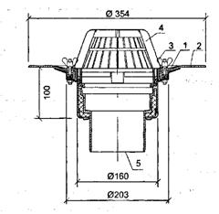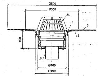 Рис. 13. "Ремонтная" воронка в разрезе (а); монтаж воронки (б) 1 - листвоуловитель (HL062.1Е); 2 - прижимной фланец (HL062.3E); 3 - накидная гайка (HL062.4E); 4 - гибкий патрубок с уплотнительными кольцами; 5 - «старая» воронка 4.11 Примыкание кровли к воронкам, расположенным на балконе, террасе или стилобате, принципиально не отличаются от вышеприведенных, при этом необходимо применять соответствующие воронки (см. табл. 2.1 - 2.3). 4.12 Воронки для стилобатов имеют чугунную решетку либо в подрамнике из полипропилена (максимальная нагрузка до 7 тс), либо в подрамнике из чугуна (максимальная нагрузка до 15 тс) (см. табл. 2.3). На рис. 14 приведена конструкция воронки HL 616.1 с максимальной нагрузкой 15 тс, с надставным элементом из полипропилена, с грязеуловителем, механическим запахозапирающим устройством. 4.13. Вокруг воронки для стилобата предусматривают укладку бетона, армированного сеткой из конструкционной стали для обеспечения устойчивости (жёсткости) её верхней части, а остальные участки могут быть выполнены также из бетона или асфальта, тротуарных плиток и т.п. (рис. 15). Высота воронки в зависимости от толщины слоев покрытия обеспечивается доборными (надставными) элементами, а водонепроницаемость примыкания к воронке водоизоляционного ковра - зажимным фланцем или приклейкой к битумно-полимерному фланцу. Примечание. При устройстве инверсионной кровли уплотнительное кольцо (см. рис. 14 поз. 9) заменяют дренажным кольцом HL190.
