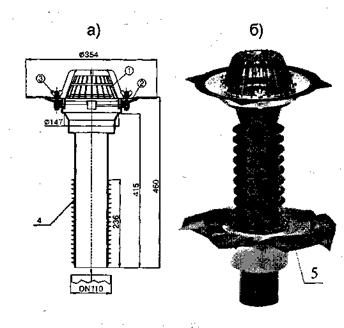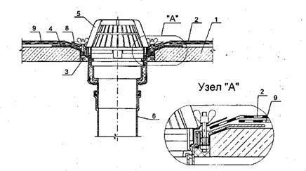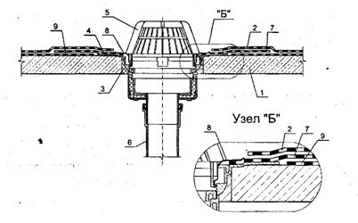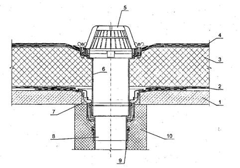 Рис. 2. Воронка HL 62 для неэксплуатируемой кровли 1 -прижимной фланец (HL 062.3E); 2 - чаша (опорный элемент) воронки; 3 - накидные гайки (HL 062.4Е); 4 - листвоуловитель (HL 062.1Е); 5 - выпуск воронки (HL 62) Рис. 3. Воронка HL 62H для неэксплуатируемых кровель 1 - прижимной фланец; 2 - чаша (опорный элемент) воронки; 3 - битумно-полимерное полотно; 4 - листвоуловитель (HL 062.1Е); 5 - выпуск воронки HL 62H 4.3. Опирание воронок осуществляют на жёсткий элемент покрытия (железобетонную плиту) чашей воронки (рис. 4). 4.4. В утеплённых покрытиях воронку опирают также на жёсткий элемент покрытия (железобетонную плиту). Через резиновый уплотнитель вставляют в кровельную воронку надставной (доборный) элемент HL 65(Н) (Р) на высоту теплоизоляционного слоя (рис. 5), заводят на него гидроизоляцию. а) б) Рис. 4. Примыкание водоизоляционного ковра к воронке HL 62 (а) и HL 62H (б). 1 - плита "холодного" покрытия; 2 - водоизоляционный ковёр; 3 – заделка утеплителем (пенополиуретаном); 4 - опорный элемент (чаша) воронки; 5 - листвоуловитель; 6 - водосточная труба; 7 - битумно-полимерное полотно; 8 - прижимной фланец; 9 - дополнительный ковер (усиление ендовы) Рис.5. Воронка на утеплённом покрытии 1 - плита покрытия; 2 - пароизоляция; 3 - теплоизоляция; 4 - водоизоляционный ковёр; 5 - листвоуловитель воронки HL62H; 6 - надставной элемент HL 65; 7 - заделка утеплителем (пенополиуретаном); 8 - корпус воронки HL 62H; 9 - водосточная труба; 10 - утепление воронки (для исключения выпадения на её поверхности конденсата). 4.5. Воронки для эксплуатируемых кровель аналогичны вышерассмотренным за исключением надставного элемента, который, как правило, имеет плоскую верхнюю решетку (рис. 6, см. также рис. 1 в и г). 4.6. На рис. 7 показаны примеры эксплуатируемой утеплённой кровли с защитным слоем из цементно-песчаных (тротуарных плиток) по стяжке (а) и по гравию (б).