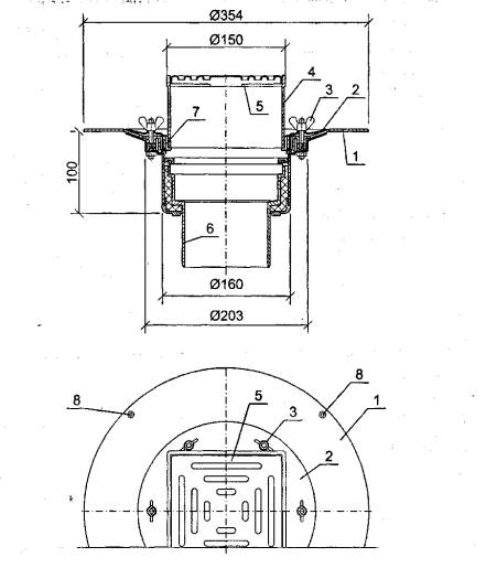 Рис. 6. Воронка HL 62В для эксплуатируемых кровель 1 - опорный элемент (чаша) воронки; 2 - прижимной фланец (HL 062. 3Е); 3 - накидные гайки (HL 062.4E); 4 - надставной элемент из полипропилена (HL 062B.2E); 5 - решётка из нержавеющей стали (HL 062В. 1Е); 6 - выпуск воронки HL 62В; 7 - дренажное кольцо (HL 062В.3Е); 8 - отверстия для крепления воронки к несущей конструкции а) б)
