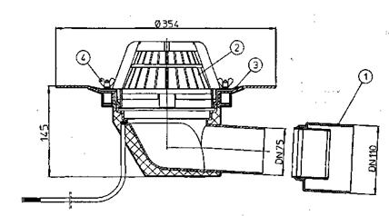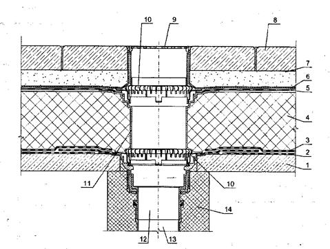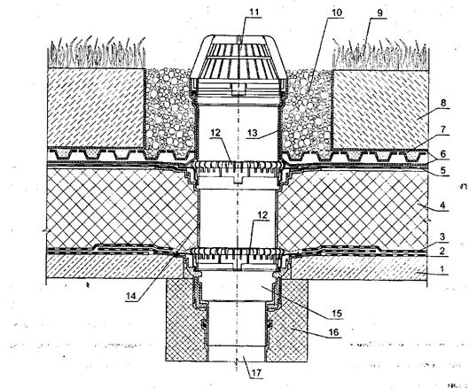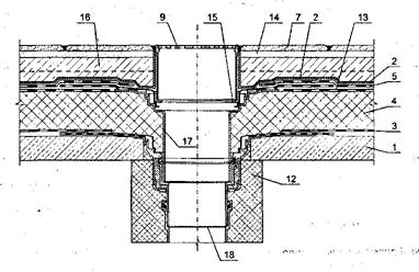 Рис. 8. Воронка HL 64.1 для кровель с горизонтальным выпуском 1 - переходник HL 0317АЕ; 2 - листвоуловитель HL 062.1 Е; 3 - прижимной фланец HL 062.3Е; 4 - накидная гайка HL 062.4E Корпус воронки жестко крепится к несущей конструкции. Горизонтальную магистраль от воронки до вертикального стояка рекомендуется выполнять диаметром 75 мм, так как ее легче разместить в кровельном «пироге», а переходник 75/110 устанавливать в месте присоединения горизонтальной магистрали к вертикальному стояку. Так как горизонтальная магистраль укладывается в утеплителе кровли, необходимо учитывать границу промерзания утеплителя в зависимости от климатических условий в месте будущего строительства здания. Если выпуск кровельной воронки находится выше границы промерзания, то для предотвращения образования ледяных пробок в выпускном патрубке необходимо применять воронки с встроенным электроподогревом. Если расстояние от воронки до теплого помещения превышает 1 м, то рекомендуется обогревать и горизонтальную магистраль. 4.8. Для «зеленой» (рис. 9) и эксплуатируемой (рис. 10) инверсионной кровли применяют те же воронки, что и для традиционной с дополнительной деталью - дренажным кольцом HL 160 для отвода просочившейся воды. В таких кровлях под почвенным слоем целесообразно использовать полимерный (полиэтиленовый или на основе ПВХ) материал ячеистой формы, позволяющий задерживать воду в гофрах (для подпитки растений) и отводить лишнюю воду через отверстия в верхних полках гофр. Поскольку в инверсионной кровле водоизоляционный ковер расположен под теплоизоляционными плитами, воронка для таких кровель должна иметь дренажное кольцо (см. рис. 9 и 10), а в качестве утеплителя применяют только экструдированные пенополистирольные плиты, прочность которых и марку воронки назначают в зависимости от назначения кровли (см. табл. 2.1 - 2.3). Рис. 9. «Зеленая» кровля с инверсионным покрытием и водосточной воронкой HL62H 1 - несущая железобетонная плита; 2 - дополнительный слой (усиление ендовы); 3 - водоизоляционный ковер; 4 - теплоизоляция из экструдированного пенополистирола; 5 - разделительный слой; 6 - фильтрующий слой (геотекстиль); 7 - полимерный материал гофрированной структуры (ячеистой формы); 8 - почвенный слой; 9 - растения; 10 - засыпка гравием вокруг воронки; 11 - листвоуловитель воронки HL62H; 12 - дренажное кольцо HL160; 13 - удлинитель HL 350; 14 - надставной элемент HL 350.1; 15 - корпус воронки HL62H; 16 - утепление воронки и водосточной трубы; 17 - водосточная труба (ПВХ или ПП) Рис. 10. Эксплуатируемая кровля с инверсионным покрытием и водосточной воронкой HL62B 1 - несущая железобетонная плита; 2 - дополнительный слой (усиление ендовы); 3 - водоизоляционный ковер; 4 - теплоизоляция из экструдированного пенополистирола; 5 - разделительный слой; 6 - фильтрующий слой (геотекстиль); 7 - засыпка из гравия; 8 - тротуарная плитка; 9 - трап воронки HL 62BH; 10 - дренажное кольцо HL160; 11 - надставной элемент HL 350.1; 12 - корпус воронки HL 62BH; 13 - водосточная труба (ПВХ или ПП); 14 - утепление воронки и водосточной трубы 4.9. Кровельная воронка на покрытии с несущим профилированным настилом отличается от других наличием монтажного короба с утеплителем, позволяющего обжимать теплоизоляционный слой (см. рис. 1е и 11, 12). Монтажный короб закрепляют к стальному листу толщиной 2-3 мм, который, в свою очередь, механически крепится к несущему профнастилу. Примечание. На с