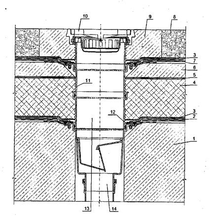 Рис. 15. Воронка HL616 (HL 616Н) стилобата 1 - монолитная железобетонная плита; 2 - пароизоляция; 3 - геотекстиль; 4 - теплоизоляция; 5 - разделительный слой; 6 - бетонная стяжка; 7 – кровельный ковер; 8 - асфальт (бетон, плитки и т.п.); 9 - бетон вокруг воронки; 10 - трап воронки HL 616 (HL 616Н); 11 - надставной элемент HL 618 (HL 618H); 12 - обжимной фланец из нержавеющей стали HL 86.0; 13 - удлинитель HL 620; 14 - корпус воронки HL616 (HL 616Н) |