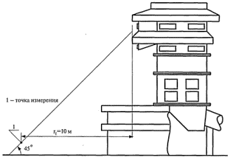 9.5.5 Для ГПА в индивидуальных укрытиях и блочно-контейнерном исполнении точки измерения уровней звука в зонах обслуживания назначаются: у контейнера турбоблока справа и слева - по три точки (точки 1-6, показанные на рисунке 7); в отсеках ГТУ и нагнетателя справа и слева - по три точки (точки 7-14, показанные на рисунке 7); у торцов агрегата - по одной точке (точки 15, 16, показанные на рисунке 7); на расстоянии 10 м от среза воздухозаборного устройства под углом 45° к горизонту - одна точка (рисунок 4); на расстоянии 20 м от среза выхлопной шахты (дымовой трубы) под углом 45° к горизонту - одна точка (рисунок 5); у технологической обвязки нагнетателя со стороны всасывания - не менее двух точек (точки 17, 18, показанные на рисунке 7); у технологической обвязки нагнетателя со стороны нагнетания - не менее двух точек (точки 19, 20, показанные на рисунке 7). 9.5.6 Во всех случаях расстояние r определяется местными условиями размещения оборудования и указывается в протоколе измерений. В соответствии с программой обслуживания могут быть назначены дополнительные (кроме указанных выше) места (точки) измерения уровней звукового давления и уровней звука. 9.5.7 На режимах пуска и остановки агрегата точки измерения уровня звука назначаются на расстоянии 5 м от среза свечи стравливания пускового и топливного газа (рисунок 6). При измерениях на этих режимах на шумомере должна быть установлена временная характеристика "S" (медленно). 9.5.8 Для электроприводных ГПА точки измерений выбираются аналогично случаю газотурбинных ГПА, за исключением точек для измерений шума всасывающей и выхлопной систем. 9.5.9 При приемочных испытаниях новых и модернизированных ГПА схема маршрута обслуживания агрегата и время пребывания работников в рабочих зонах регламентированы технической документацией на агрегат. ТД предоставляет завод-изготовитель. При испытаниях эксплуатируемого ГПА ТД предоставляет газотранспортная организация. 9.5.10 Для оценки условий работы работников на неработающем испытываемом ГПА, но при работе соседних в цехе ГПА, производят следующие измерения уровней звукового давления и уровней звука: - в индивидуальном здании в помещениях привода и нагнетателя; - в месте проведения работ по обслуживанию остановленного двигателя и его замене. 9.6 Точки измерений уровней звукового давления и уровней звука для оценки шумового режима на селитебных территориях назначают: на расстоянии 100 м от цехового помещения (контейнера) в направлении всасывания - три точки (точки 1, 2, 8, показанные на рисунках 8, 9); па расстоянии 100 м от цехового помещения (контейнера) в направлении выхлопа - три точки (точки 4, 5, 6, показанные на рисунках 8, 9); на расстоянии 100 м в боковых направлениях от цехового помещения (контейнера) - две точки (точки 3, 7, показанные на рисунках 8, 9). 10 Методы измерений10.1 Измерение уровней звукового давления проводятся в октавных полосах частот со среднегеометрическими частотами от 31,5 до 8000,0 Гц и уровней звука по шкале "А" шумомера. 10.2 Значения уровней звукового давления и уровня звука необходимо считывать со шкалы прибора с точностью до 1 дБ (дБА). 10.3 Измерения уровней звукового давления и уровней звука в каждой точке производят не менее трех раз. 10.4 При колебании уровней звука и уровней звукового давления ГПА в пределах 5 дБ длительность измерений должна превышать период колебаний не мене